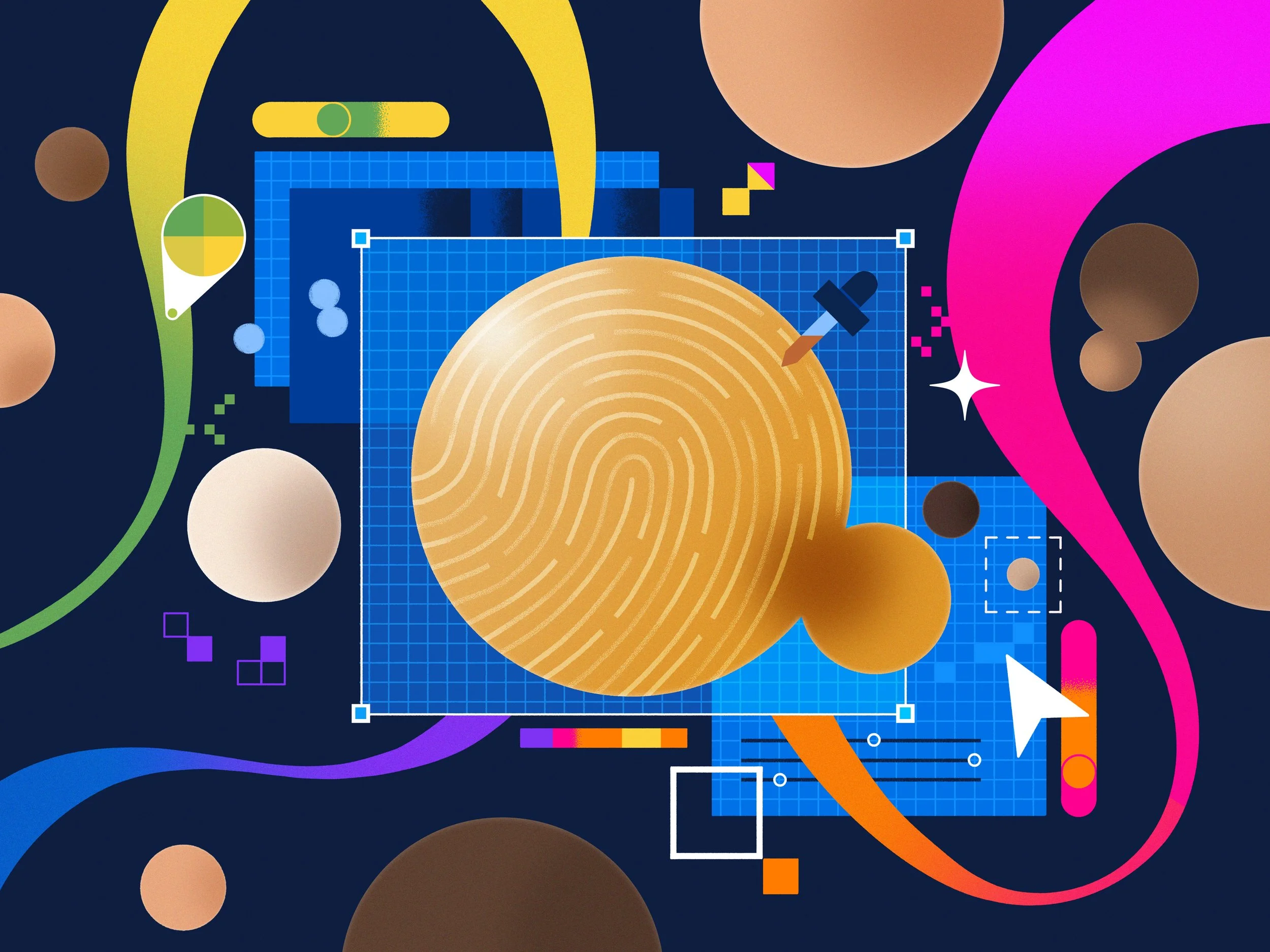 Header illustration created for an article exploring how the design team is improving representation within their 3D Assets library. The artwork visualizes the intersection of the real and digital worlds, highlighting the importance of accurately capturing diverse human skin tones and features within 3D design tools.
