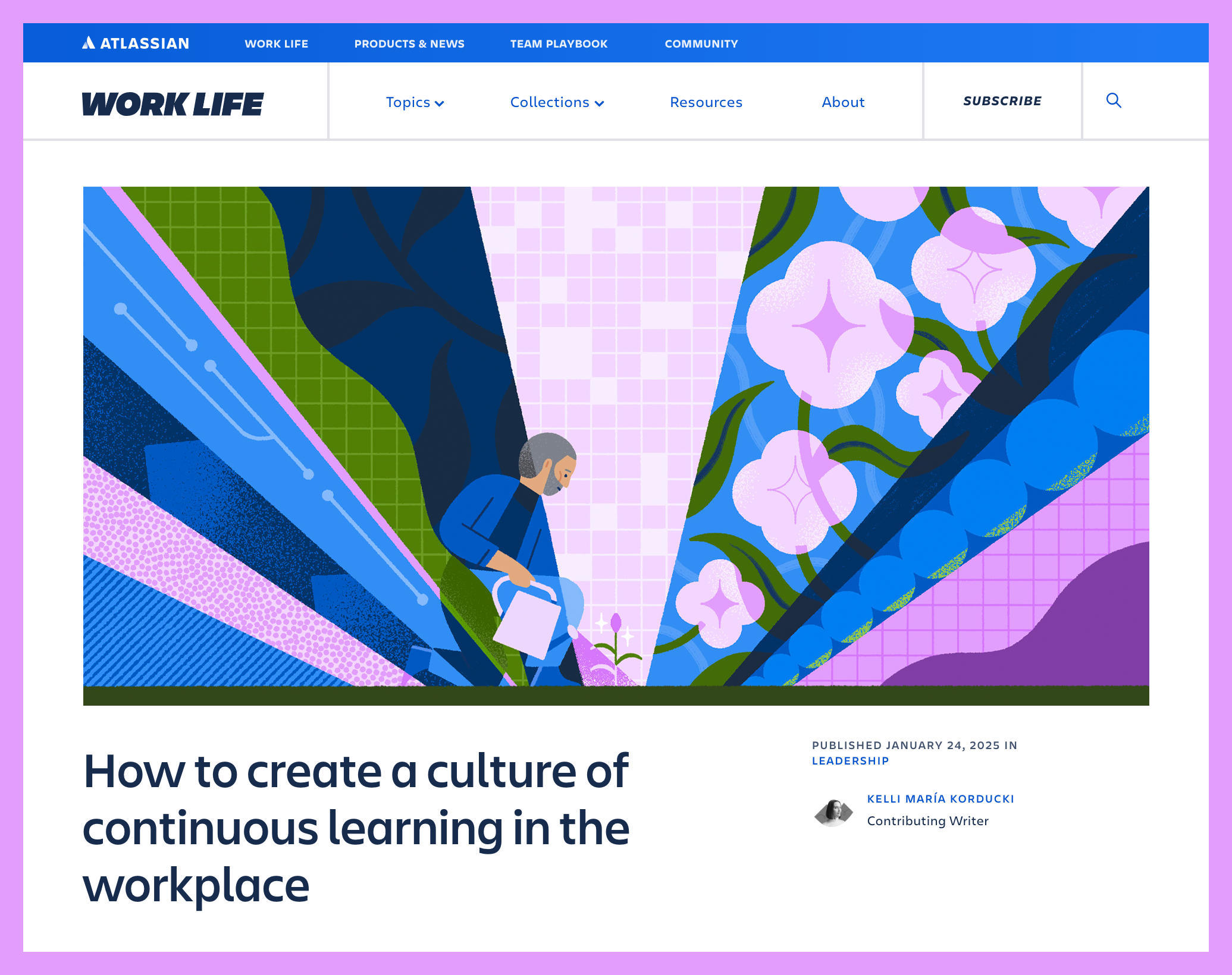 Illustration commissioned by Atlassian for their digital publication Work Life, supporting an article on nurturing a culture of learning within the workplace.