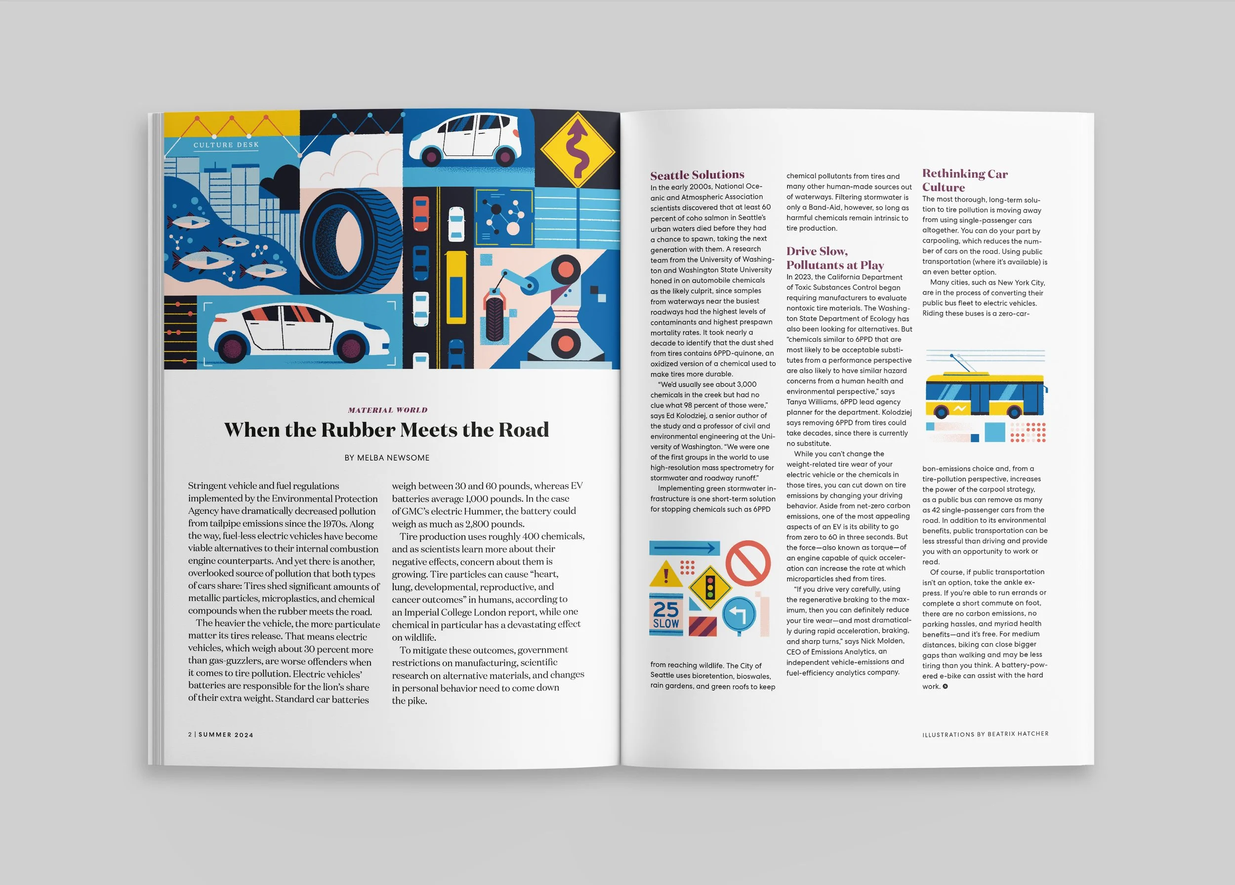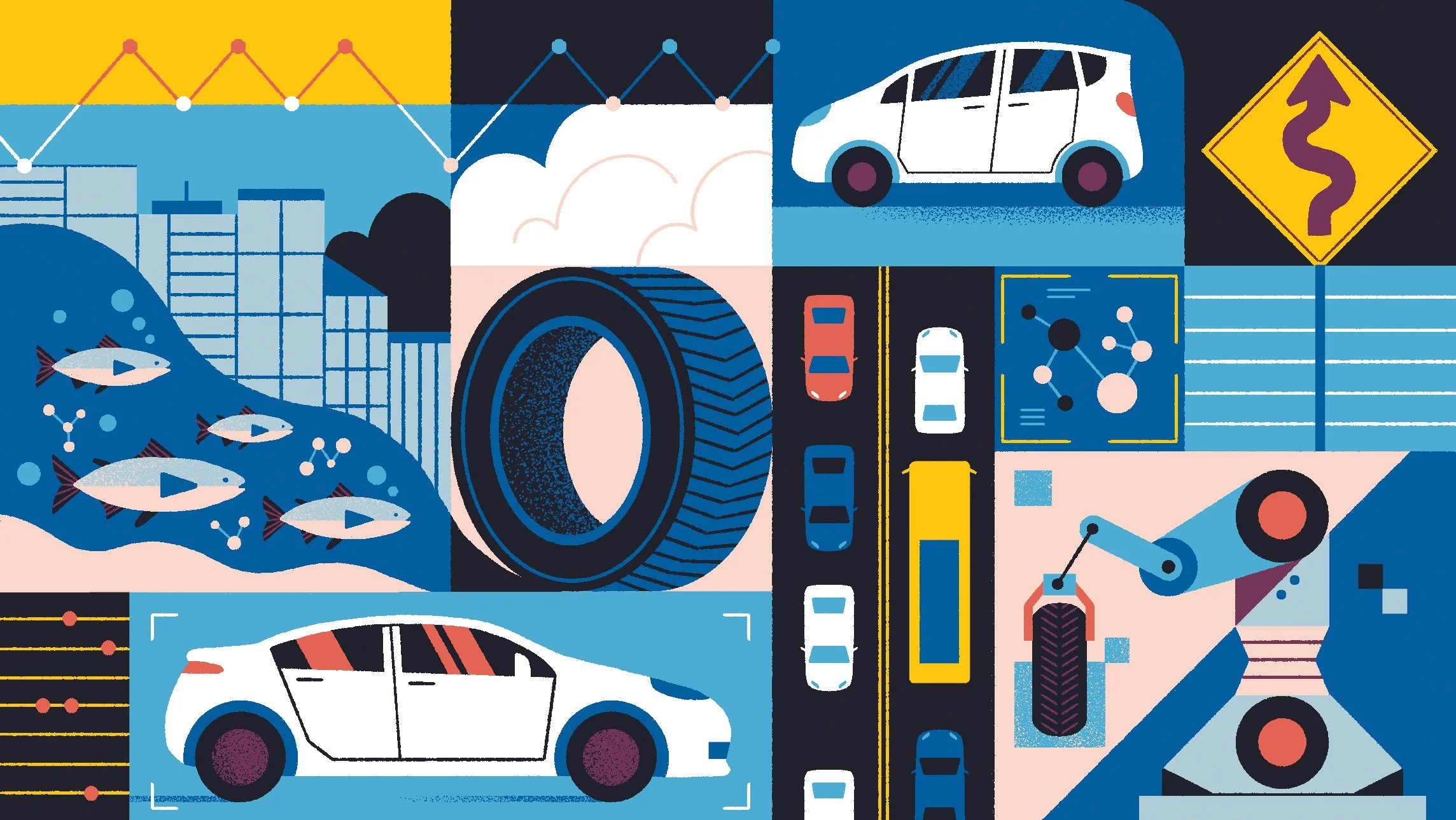 Header and spot illustrations commissioned by the Sierra Club for their publication, Sierra, accompanying an article exploring the environmental impact of electric vehicle tyres